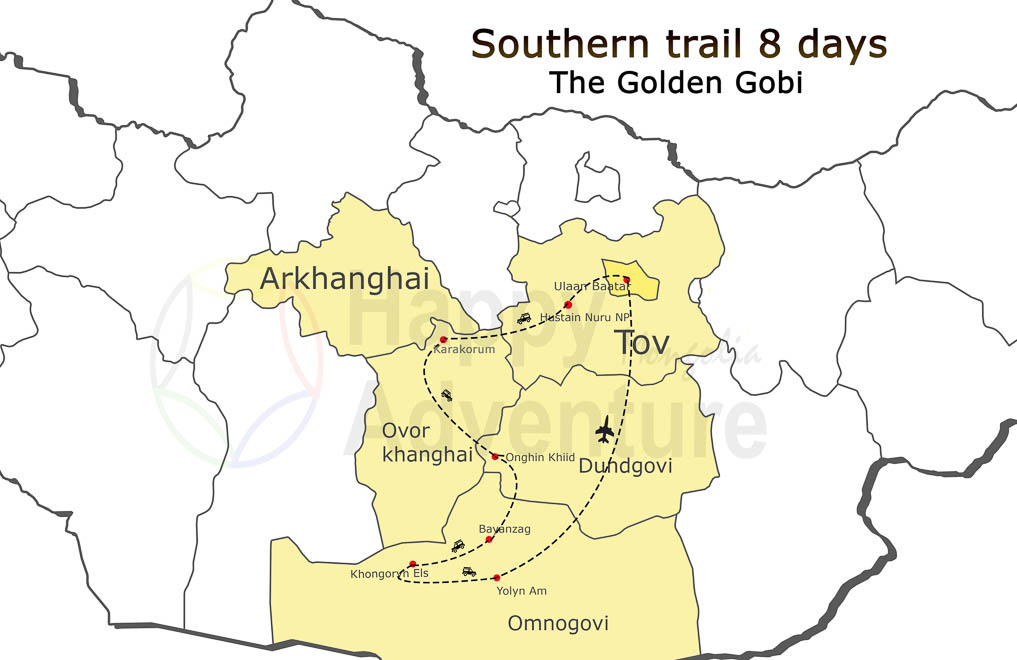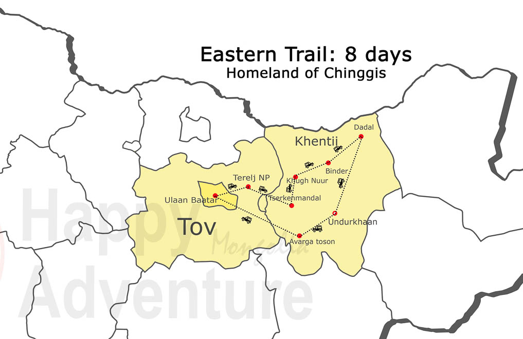 Endless horizons with flowers, rivers and nomads with their animals… On the way you will encounter a lot of places associated with the life of Chinggis Khan. You can relax in a mud spa after doing some of the most interesting hiking, horse-riding or canoeing in the country!